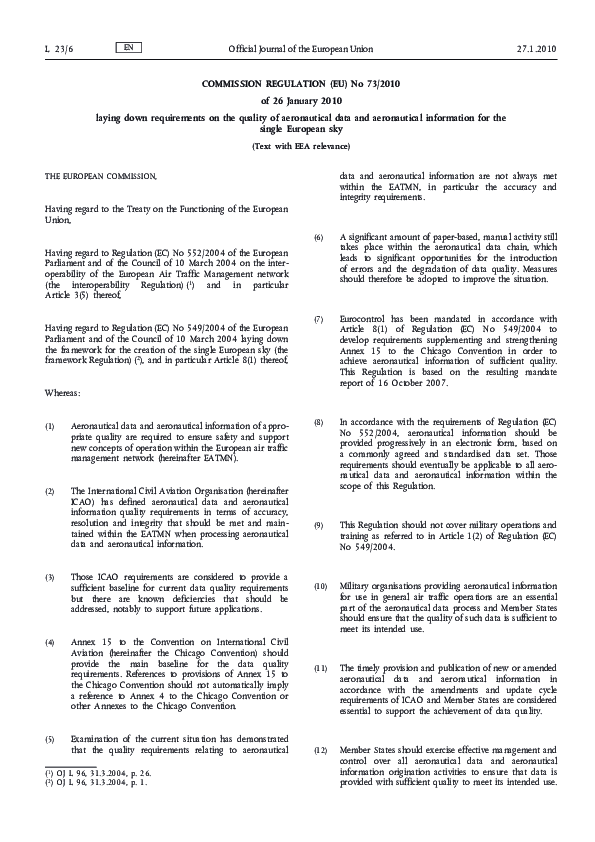 Commission Regulation (EU) No 73/2010 of 26 January 2010 laying down requirements on the quality of aeronautical data and aeronautical information for the Single European Sky. This Regulation has been adopted to ensure improved quality of aeronautical data and aeronautical information provision in Europe in terms of accuracy, resolution and integrity.