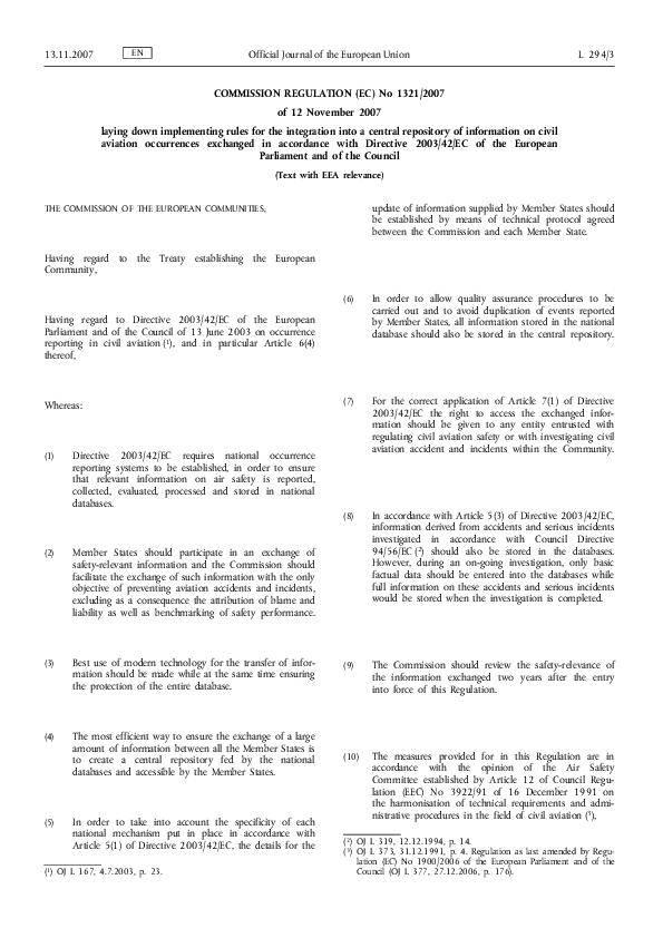 Regulation (EC) No 1321/2007 - laying down implementing rules for the integration into a central rep