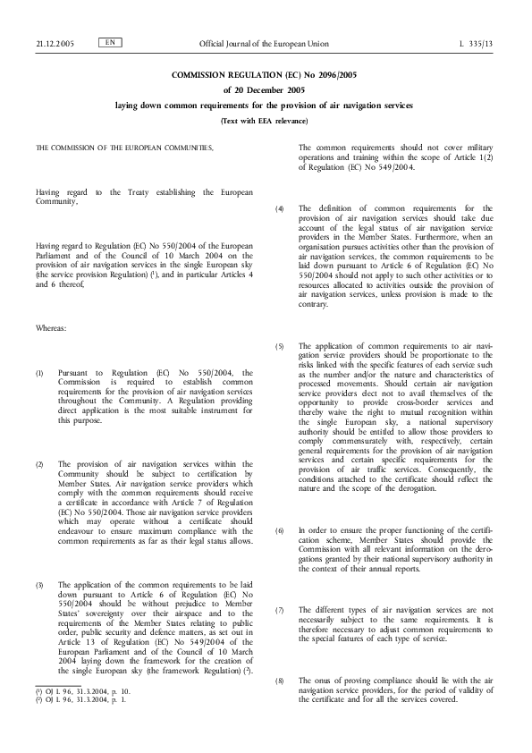 Regulation (EC) No 2096/2005 laying down common requirements for the provision of air navigation ser