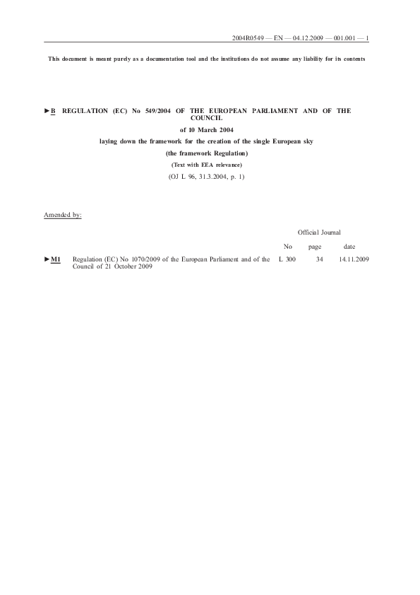 REGULATION (EC) No 549/2004 OF THE EUROPEAN PARLIAMENT AND OF THE COUNCIL of 10 March 2004 laying down the framework for the creation of the single European sky (the framework Regulation)