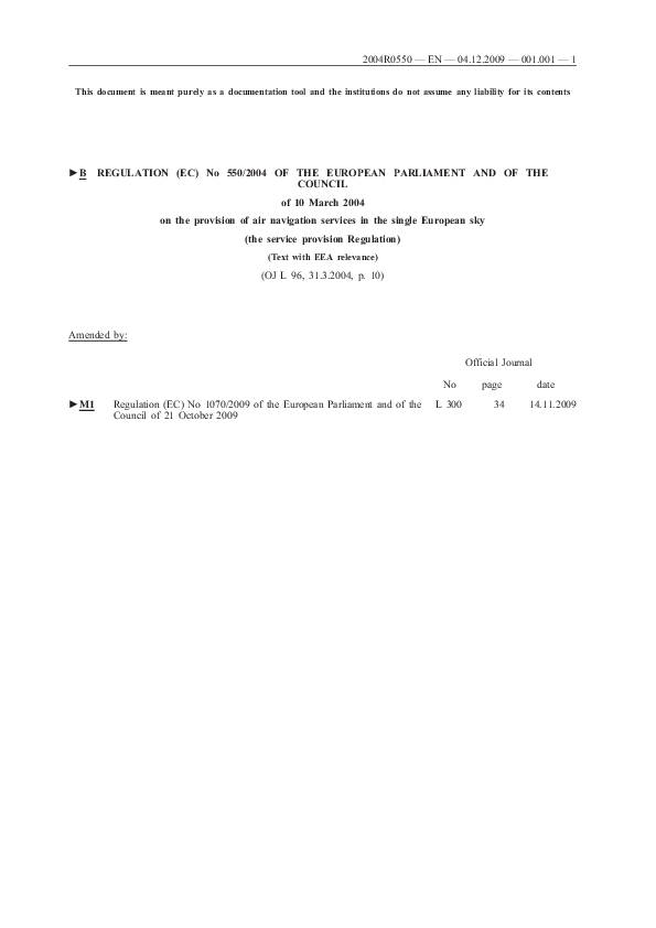 REGULATION (EC) No 550/2004 OF THE EUROPEAN PARLIAMENT AND OF THE COUNCIL of 10 March 2004 on the provision of air navigation services in the single European sky (the service provision Regulation)