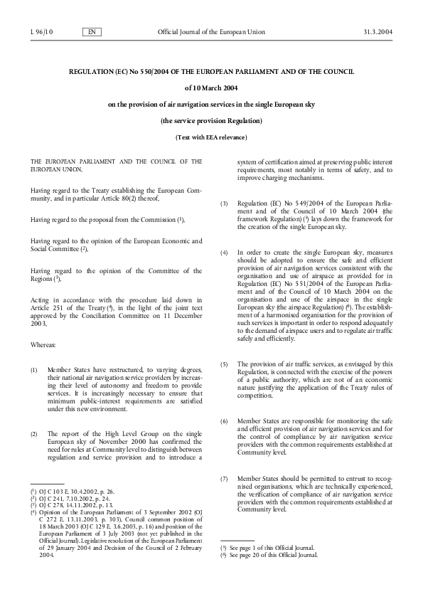 Regulation (EC) No 550/2004 of the European Parliament and of the Council on the provision of air na
