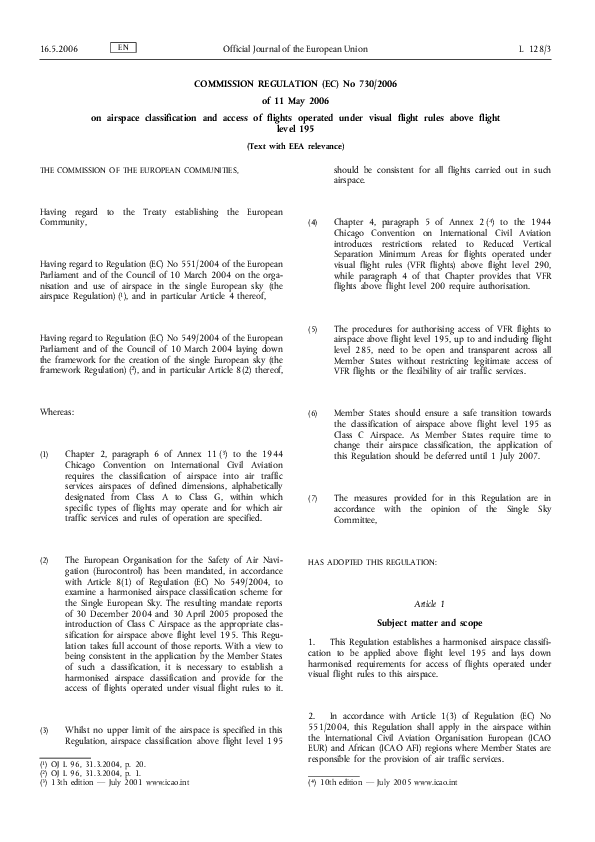 Regulation (EC) No 730/2006 on airspace classification and access of flights operated under visual f