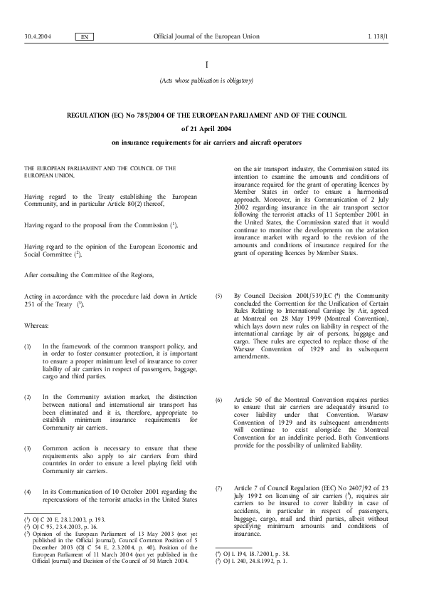 Regulation (EC) No 785/2004 of the European Parliament and of the Council of 21 April 2004