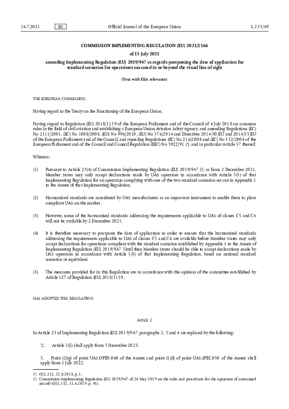 COMMISSION IMPLEMENTING REGULATION (EU) 2021/1166 of 15 July 2021 amending Implementing Regulation (EU) 2019/947 as regards postponing the date of application for standard scenarios for operations executed in or beyond the visual line of sight
