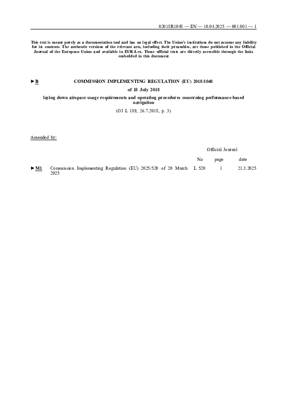 Regulation (EU) No 2018/1048 - Airspace Usage Requirements and Operating Procedures Concerning PBN