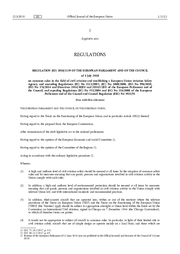 Regulation (EU) No 2018/1139 of the European Parliament and of the Council of 4 July 2018 on common rules in the field of civil aviation and establishing a European Union Aviation Safety Agency, and amending Regulations (EC) No 2111/2005, (EC) No 1008/2008, (EU) No 996/2010, (EU) No 376/2014 and Directives 2014/30/EU and 2014/53/EU of the European Parliament and of the Council, and repealing Regulations (EC) No 552/2004 and (EC) No 216/2008 of the European Parliament and of the Council and Council Regulation (EEC) No 3922/91.
