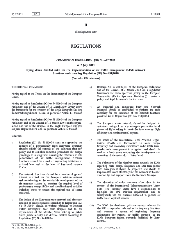 Commission Regulation (EU) No 677/2011 of 7 July 2011laying down detailed rules for the implementation of air traffic management (ATM) network functions and amending Regulation (EU) No 691/2010