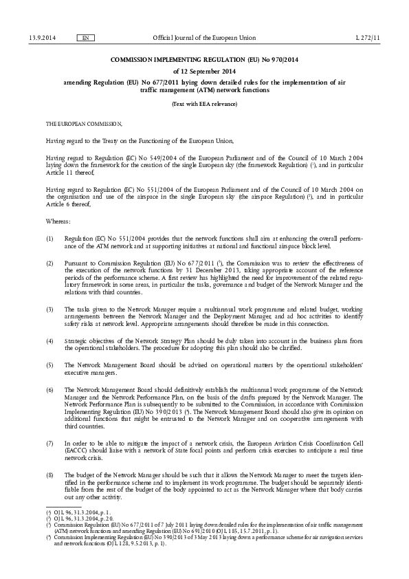 Commission Implementing Regulation No 970/2014 aims to improve Single European Sky (SES) II regulatory framework in some areas, in particular Regulation No 677/2011 laying down detailed rules for the implementation of ATM network functions provisions regarding the tasks, governance and budget of the Network Manager and the relations with third countries