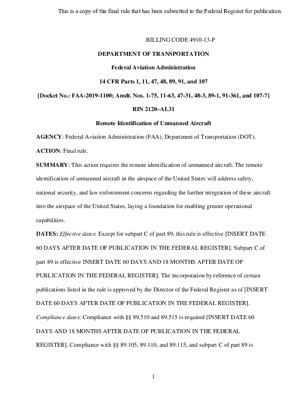 Remote Identification of Unmanned Aircraft, FAA, Final Rule