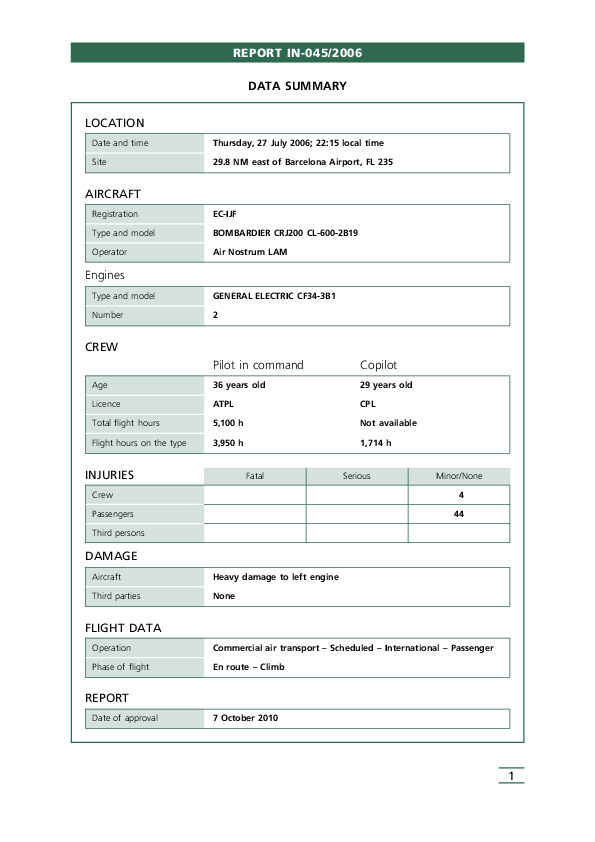 REPORT IN-045/2006, CRJ2 engine failure, Barcelona, Spain, 27 July 2006