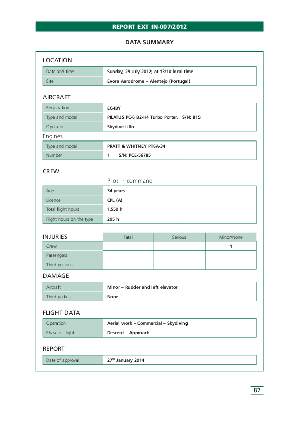 Report INT EXT 2012/007, PC6, mechanical failure in flight, Évora Portugal, 29 July 2012