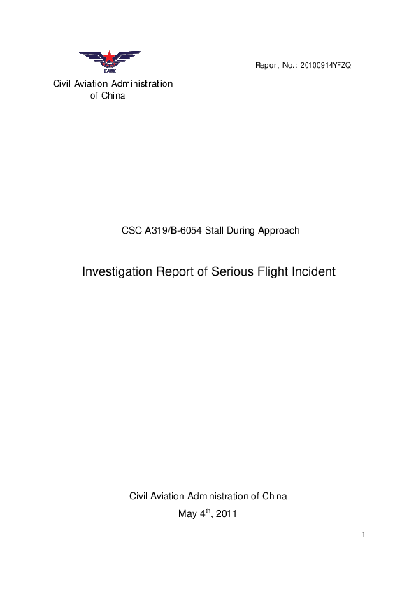 Report No.: 20100914YFZQ, A319 stall during approach, Wuxi China, 14 Sept 2010