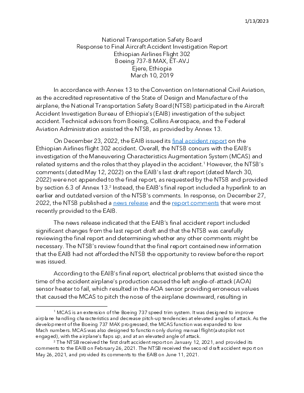NTSB Response to Final Aircraft Accident Investigation Report Ethiopian Airlines Flight 302 Boeing 737-8 MAX, ET-AVJ Ejere, Ethiopia March 10, 2019