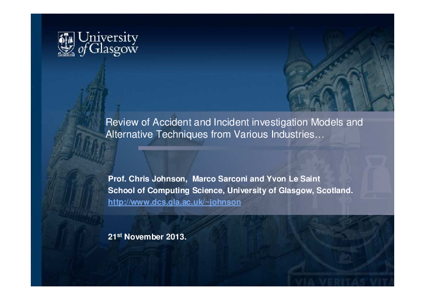 This presentation provides an overview of the accident and incident investigation models and alternative techniques from various industries, focusing on the need for ATM engineering incident reports and the impact of the cybersecurity directive from 2013 and also some sub-orbital debris and AIRPROX models.