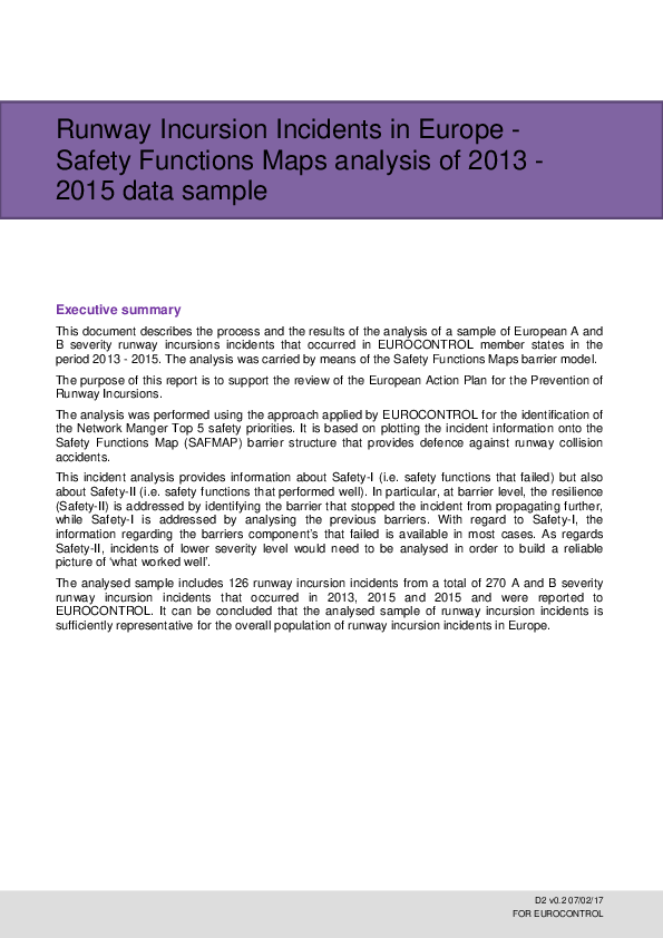 This document describes the process and the results of the analysis of a sample of European A and B severity runway incursions incidents that occurred in EUROCONTROL member states in the period 2013 - 2015. The analysis was carried by means of the Safety Functions Maps barrier model. The purpose of this report is to support the review of the European Action Plan for the Prevention of Runway Incursions.