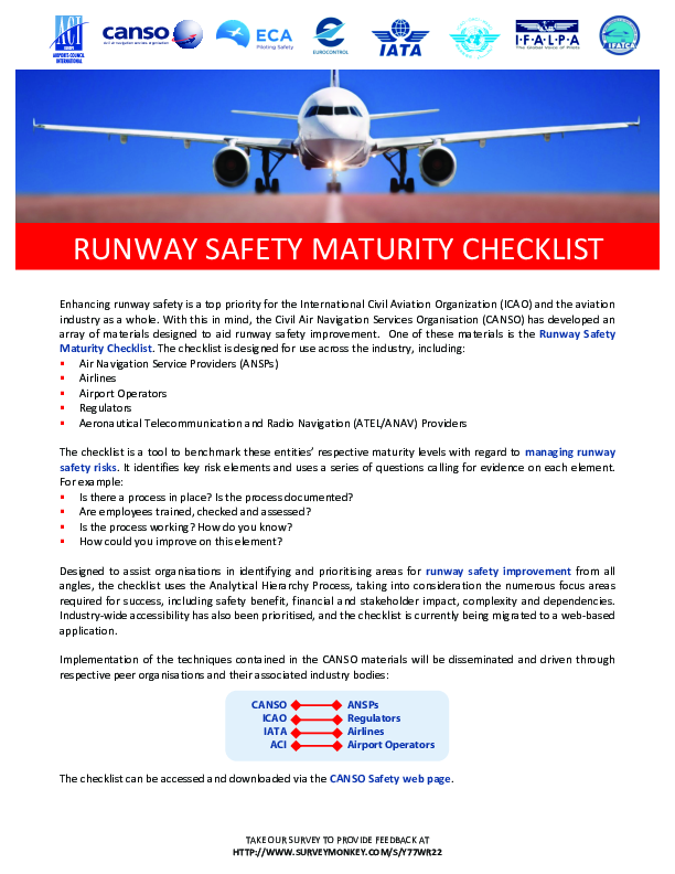 The checklist is a tool to benchmark aviation stakeholders’ respective maturity levels with regard to managing runway safety risks. It identifies key risk elements and uses a series of questions calling for evidence on each element.