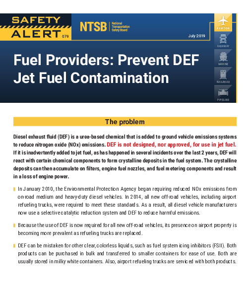 Safety Alert 079: Fuel Providers: Prevent DEF Jet Fuel Contamination
