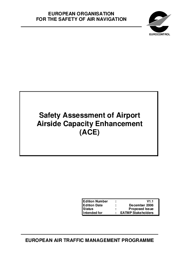 This document presents a safety assessment of the Airside Capacity Enhancement (ACE) Project. All the ACE recommended practices have been analysed individually and collectively. Risk mitigation, based primarily on documentation from ICAO, the European Action Plan for the Prevention of Runway Incursions (EAPPRI) and the ACE project, has been identified with the aim of ensuring that airport risks do not increase.