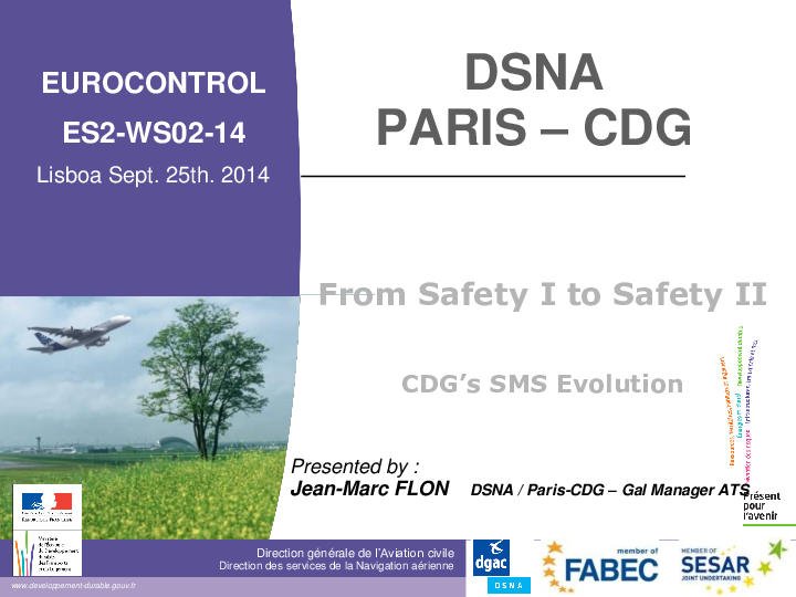 This is a presentation about Paris CDG's approach and organisation, the transition from safety I to safety II approach, the safety action plan and the safety KPIs and strategy until 2020.