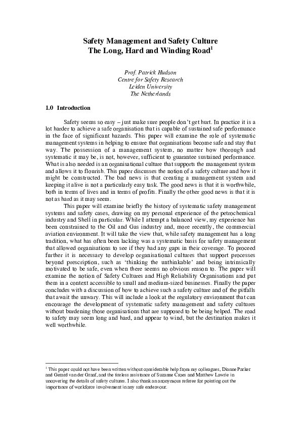 Safety Management & Safety Culture: The Long Hard Winding Road