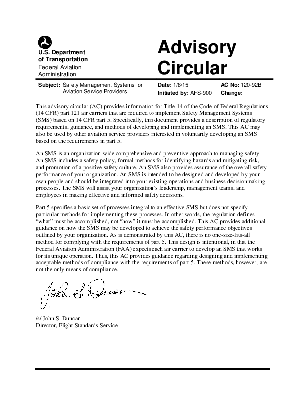 Safety Management Systems for Aviation Service Providers, AC 120-92B