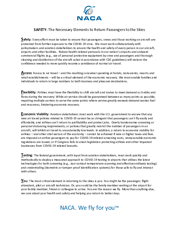 National Air Carrier Association principles for the resumption of regular commercial flight operations in the wake of the COVID-19 pandemic.