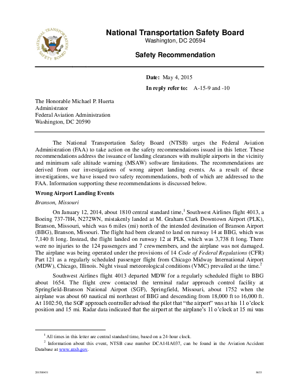 Safety Recommendation Letter to FAA: issuance of landing clearances with multiple airports in the vi