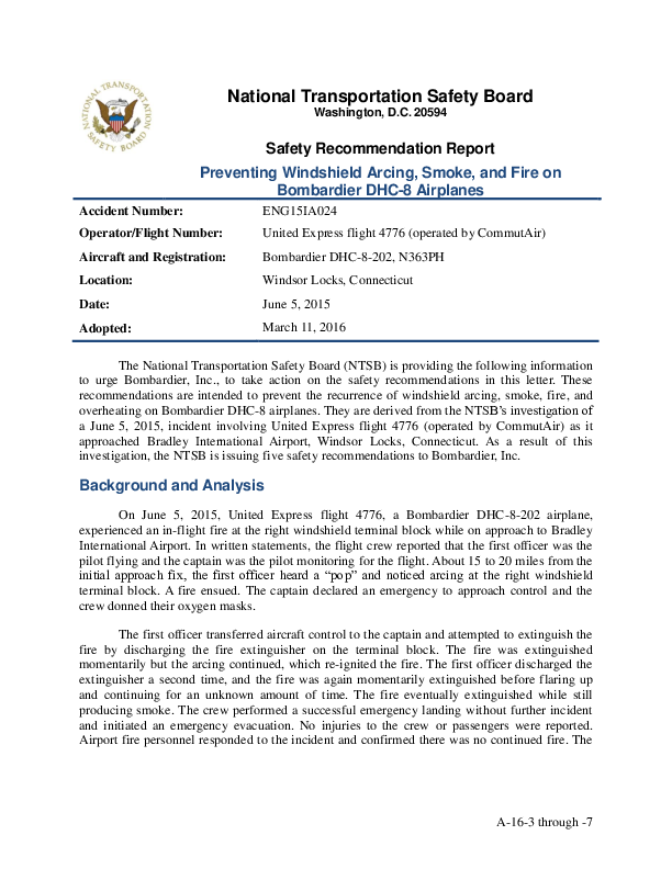 The National Transportation Safety Board (NTSB) is providing the following information to urge Bombardier, Inc., to take action on the safety recommendations in this letter. These recommendations are intended to prevent the recurrence of windshield arcing, smoke, fire, and overheating on Bombardier DHC-8 airplanes. They are derived from the NTSB's investigation of a June 5, 2015, incident involving United Express flight 4776 (operated by CommutAir) as it approached Bradley International Airport, Windsor Locks, Connecticut. As a result of this investigation, the NTSB is issuing five safety recommendations to Bombardier, Inc.