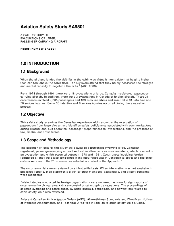 This safety study examines the Canadian experience with respect to the evacuation of passengers from large aircraft and identifies safety deficiencies associated with communications during evacuations, exit operation, passenger preparedness for evacuations, and the presence of fire, smoke, and toxic fumes.