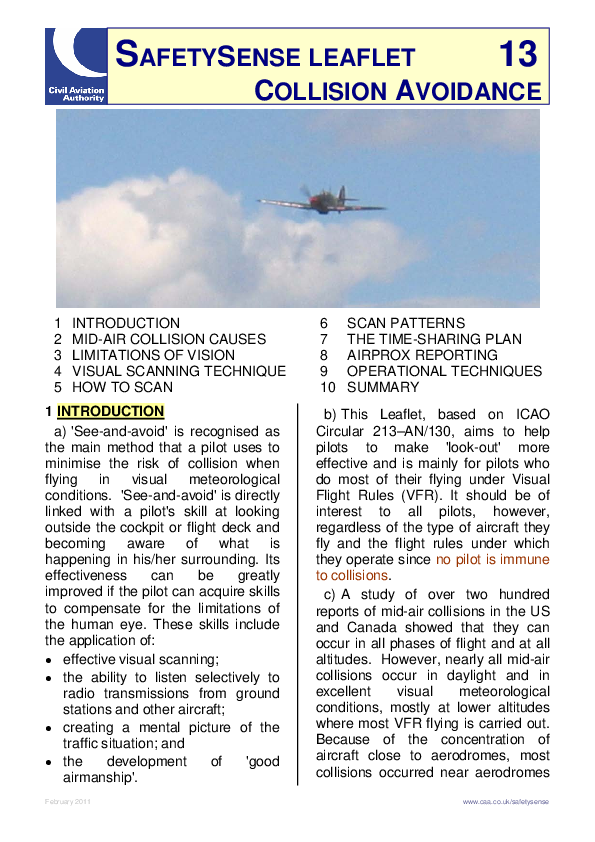 This Leaflet, based on ICAO Circular 213 AN/ 130, aims to help pilots to make 'look-out' more effective and is mainly for pilots who do most of their flying under visual flight rules (VFR).