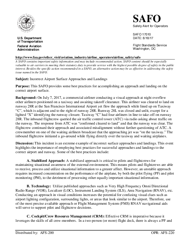 SAFO 17010: Incorrect Airport Surface Approaches and Landings
