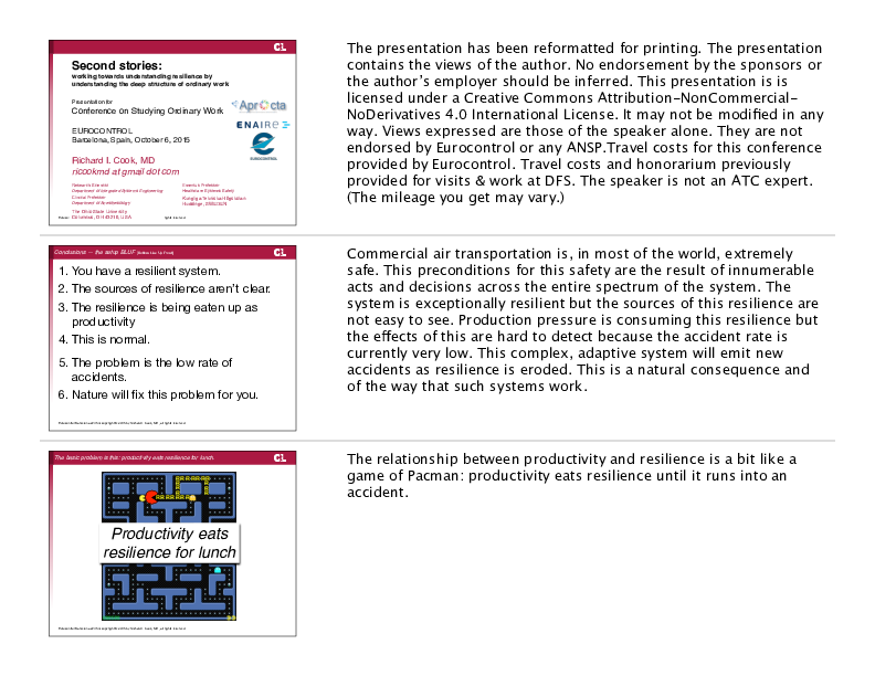 This presentation focuses on the resilience of the system and the idea of the second stories is that looking narrowly at failure obscures the complexity, conflicts and uncertainty of ordinary work. Second stories are about how people work and succeed in managing the conflicts and competing demands of everyday work.
