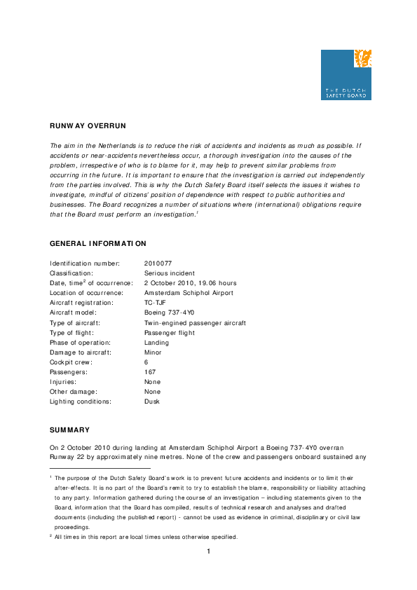 Serious Incident Investigation Report 2010077, B734 runway overrun, Amsterdam, 2 Oct 2010
