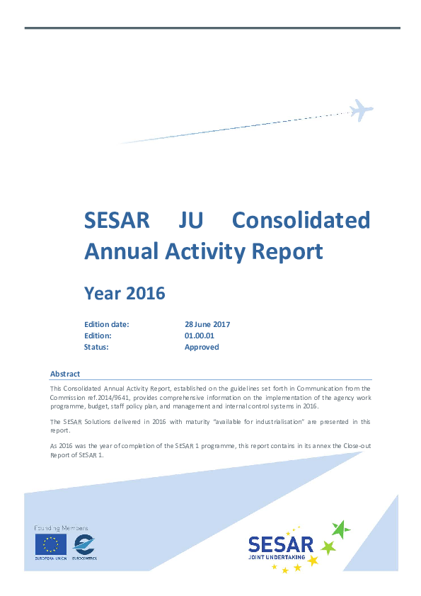 This Consolidated Annual Activity Report, established on the guidelines set forth in Communication from the Commission ref.2014/9641, provides comprehensive information on the implementation of the agency work programme, budget, staff policy plan, and management and internal control systems in 2016. The SESAR Solutions delivered in 2016 with maturity “available for industrialisation are presented in this report. As 2016 was the year of completion of the SESAR 1 programme, this report contains in its annex the Close out Report of SESAR 1.