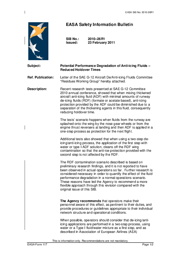 SIB 2010-26R1: Potential Performance Degradation of Anti-icing Fluids - Reduced Holdover Times