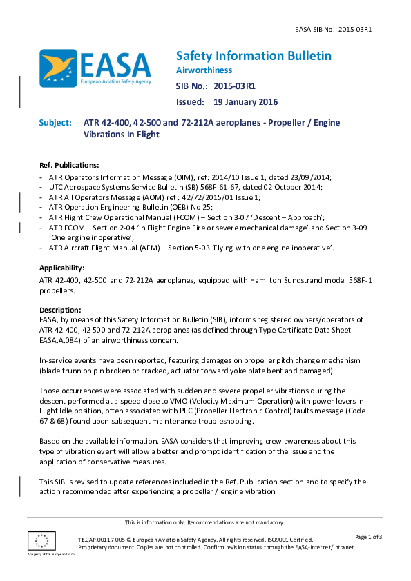 Safety Information Bulletin (SIB) 2015-3R1: ATR 42-400, 42-500 and 72-212A aeroplanes - Propeller / Engine Vibrations In Flight