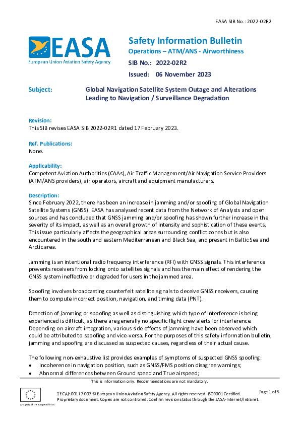 SIB 2022-02R2: GNSS Outage and Alterations Leading to Navigation / Surveillance Degradation