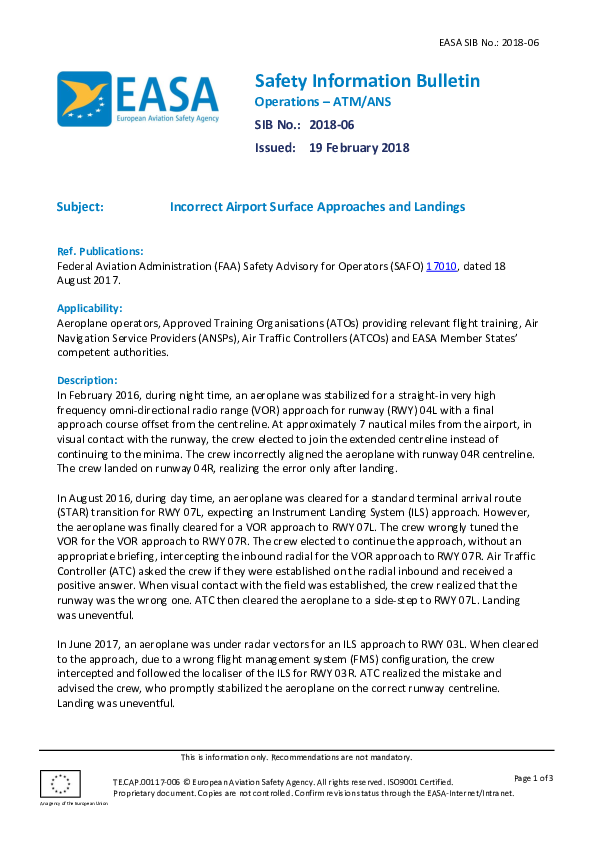 SIB No.: 2018-06 Incorrect Airport Surface Approaches and Landings