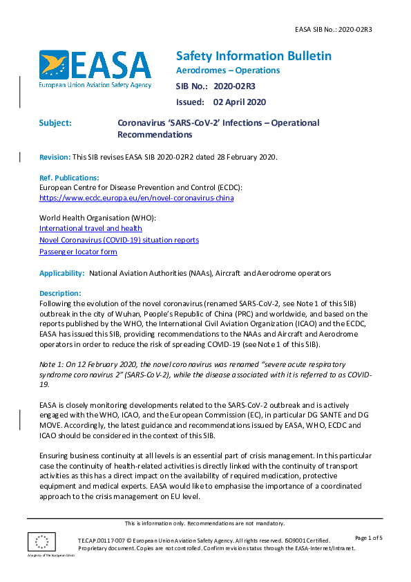 Following the evolution of the novel coronavirus (renamed SARS-CoV-2, see Note 1 of this SIB) outbreak in the city of Wuhan, People's Republic of China (PRC) and worldwide, and based on the reports published by the WHO, the International Civil Aviation Organization (ICAO) and the ECDC, EASA has issued this SIB, providing recommendations to the NAAs and Aircraft and Aerodrome operators in order to reduce the risk of spreading COVID-19 (see Note 1 of this SIB).