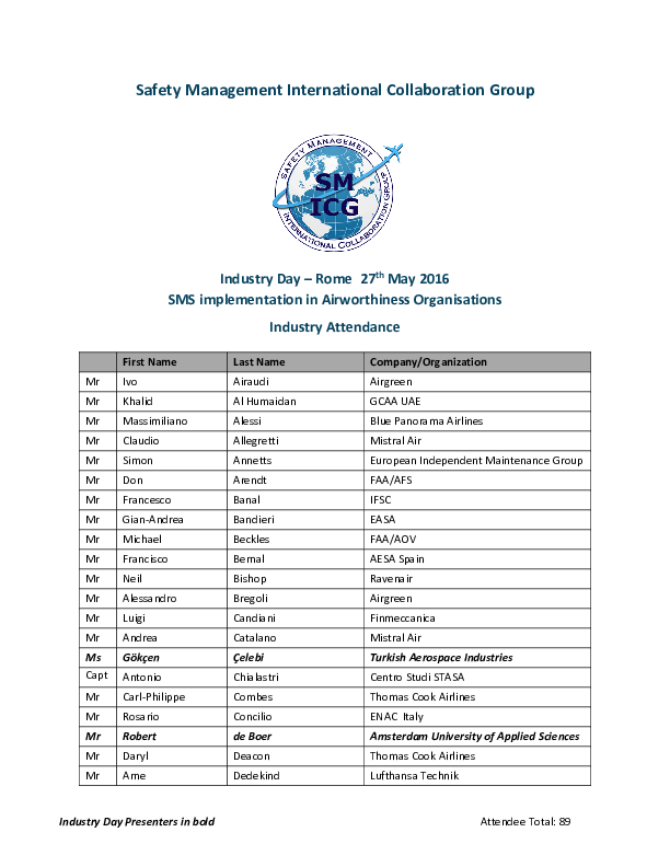 Attendee list at SM ICG industry day in Rome, May 2016