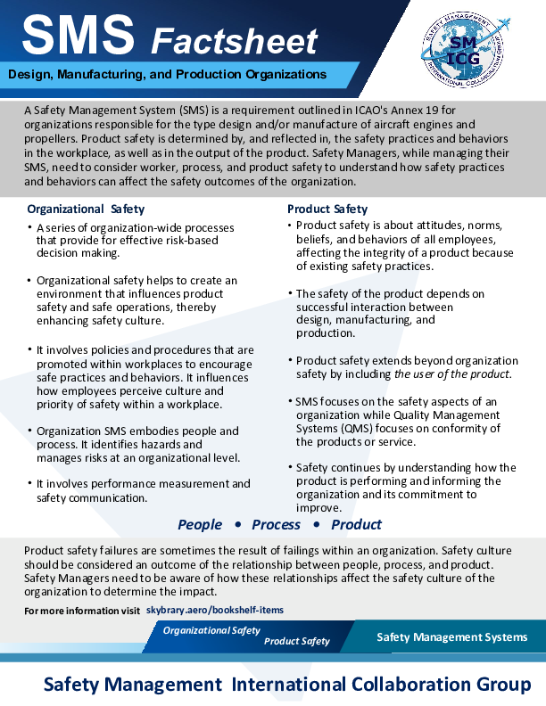 A Safety Management System (SMS) is a requirement outlined in ICAO's Annex 19 for organizations responsible for the type design and/or manufacture of aircraft engines and propellers. Product safety is determined by, and reflected in, the safety practices and behaviors in the workplace, as well as in the output of the product.