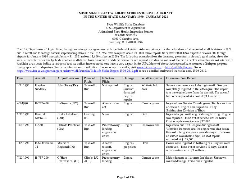 SOME SIGNIFICANT WILDLIFE STRIKES TO CIVIL AIRCRAFT IN THE UNITED STATES, JANUARY 1990 –JANUARY 2021
