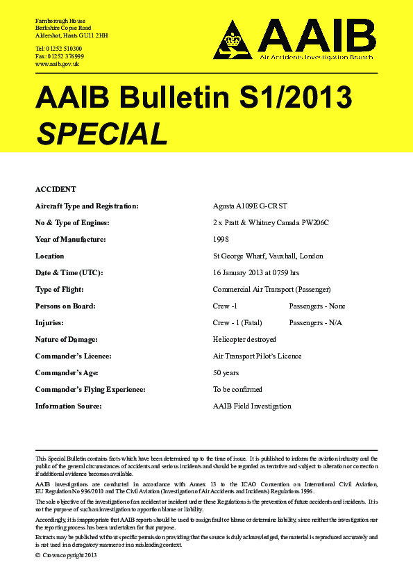 The helicopter was flying to the east of Battersea Heliport when it struck the jib of a crane, attached to a building development at St George Wharf, at a height of approximately 700 ft in conditions of reduced meteorological visibility. The pilot, who was the sole occupant of the helicopter, and a pedestrian were fatally injured when the damaged helicopter impacted a building and adjacent roadway. This Special Bulletin presents facts determined up to the time of issue and offers no analysis.