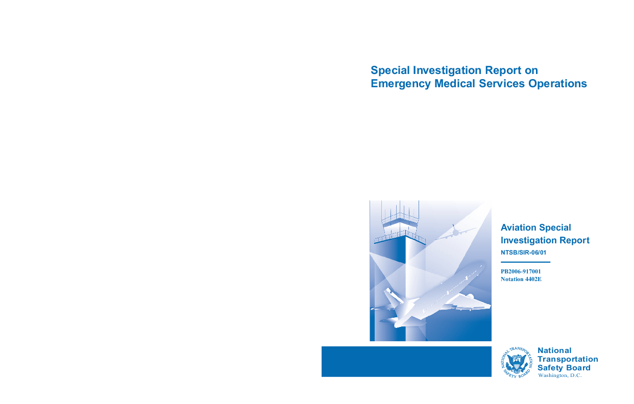 Aviation Special Investigation Report NTSB/SIR-06/01 PB2006-917001 Notation 4402E This report discusses safety issues identified during the Safety Board's special investigation of 55 emergency medical services (EMS) aircraft accidents that occurred in the United States between January 2002 and January 2005.