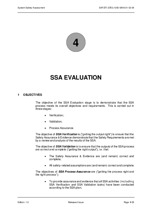 The objective of this SSA Evaluation step is to demonstrate that the SSA process meets its overall objectives and requirements. The Evaluation is carried out in three stages: Verification, Validation and Process Assurance.