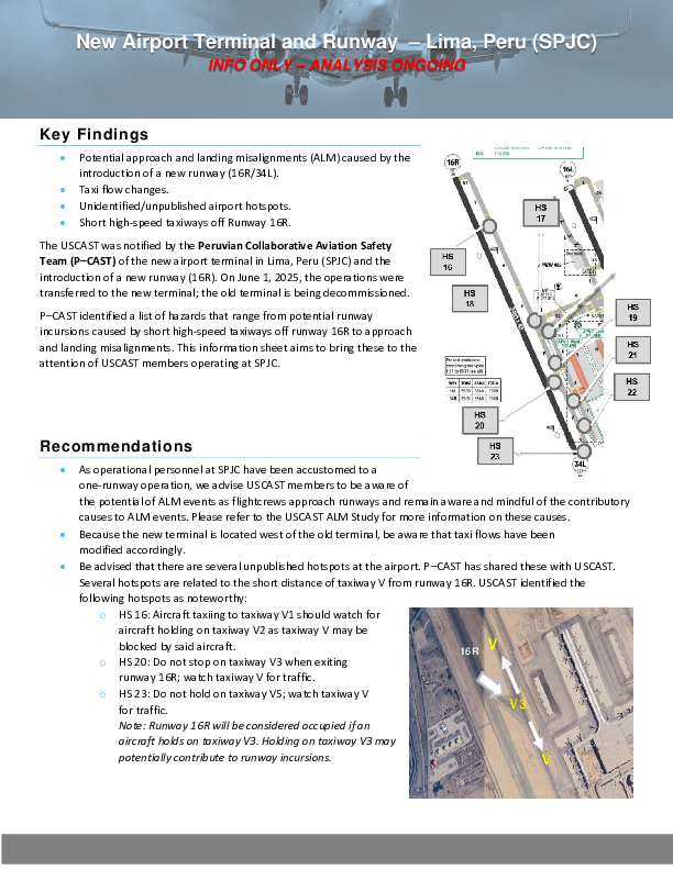 Key operational safety considerations following the opening of a new terminal and parallel runway (16R/34L) at Jorge Chávez International Airport (SPJC) in Lima, Peru. Developed in collaboration with the Peruvian Collaborative Aviation Safety Team (P-CAST) and the U.S. Commercial Aviation Safety Team (USCAST), this information sheet identifies emerging hazards such as approach and landing misalignments (ALM), taxiway flow changes, and unpublished hotspots that may increase the risk of runway incursions—especially given the transition from a single-runway to a dual-runway environment. Operators flying into SPJC are encouraged to review these insights and consider them in flightcrew briefings and operational risk assessments.