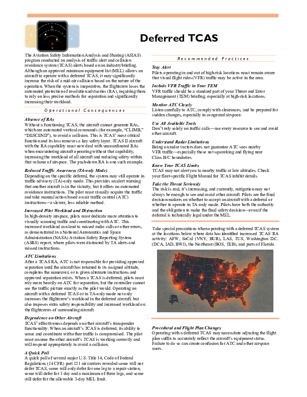 This document explains the operational implications of flying with deferred TCAS or TA-only mode, including loss of RA capability, increased pilot workload, greater reliance on ATC, and reduced traffic awareness. It also outlines recommended practices such as vigilant traffic scanning, use of all available tools, and clear ATC communication to maintain safety until full TCAS service is restored.