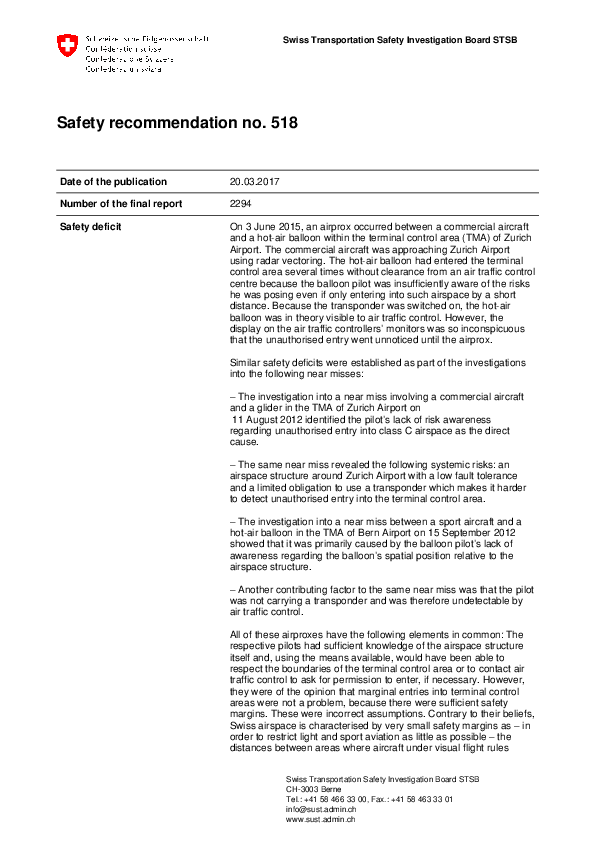 Unimplemented safety recommendation re: Swiss airspace infringement incidents