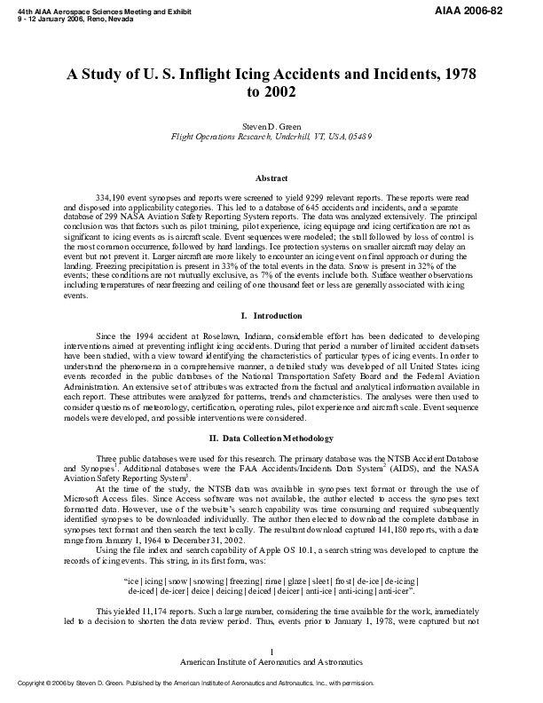 334,190 event synopses and reports were screened to yield 9299 relevant reports. These reports were read and disposed into applicability categories. This led to a database of 645 accidents and incidents, and a separate database of 299 NASA Aviation Safety Reporting System reports. The data was analyzed extensively. The principal conclusion was that factors such as pilot training, pilot experience, icing equipage and icing certification are not as significant to icing events as is aircraft scale. Event sequences were modeled; the stall followed by loss of control is the most common occurrence, followed by hard landings. Ice protection systems on smaller aircraft may delay an event but not prevent it. Larger aircraft are more likely to encounter an icing event on final approach or during the landing. Freezing precipitation is present in 33% of the total events in the data. Snow is present in 32% of the events; these conditions are not mutually exclusive, as 7% of the events include both. Surface weather observations including temperatures of near freezing and ceiling of one thousand feet or less are generally associated with icing events.